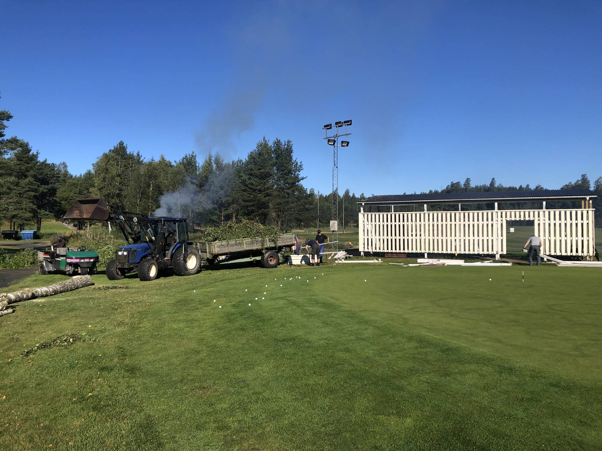 Vi har börjat med nedtagning av träd och nedmontering av utslagsboden. Det fantastiska Måndagsgänget hjälper till med att montera ner boden. Under nästa vecka(38) kommer vi att helt att ha monterat ner boden och i slutet av veckan plockar vi upp markstenen på utslagsplatsen vid Puttinggreen.
