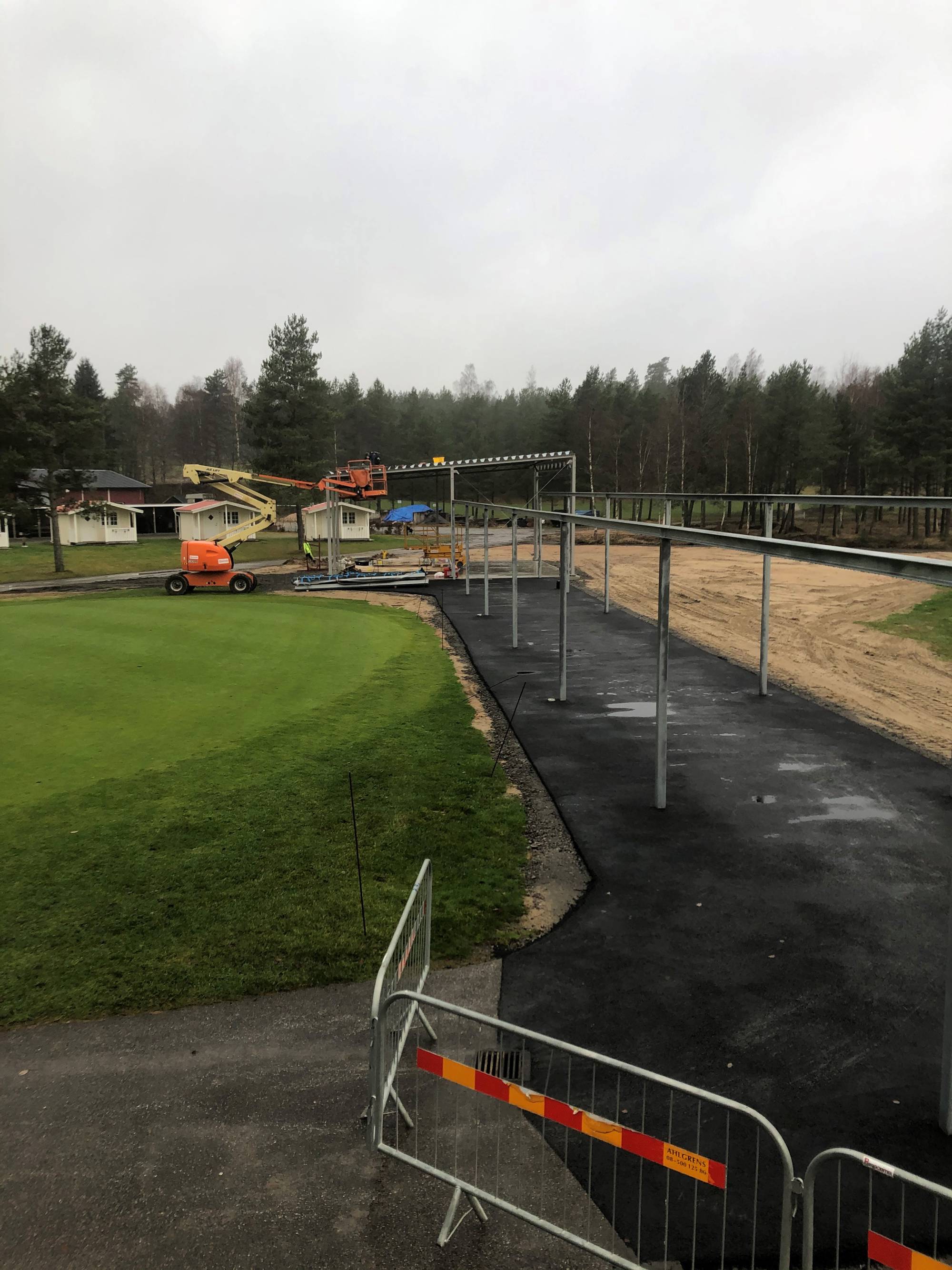 Asfalteringen blev klar förra veckan. Idag måndag är takläggningen påbörjad på Studion. Därefter läggs det tak över utslagsplatserna.